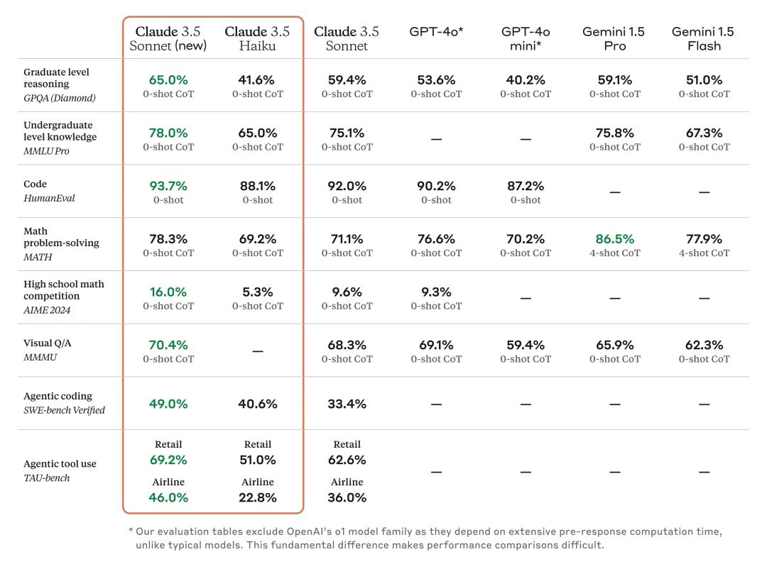 Claude 3.5 Sonnet:行业领先的软件工程技能更新版的 Claude 3.5 Sonnet 在行业基准测试中显示出广泛的改进,特别是在智能体编码和工具使用任务上取得了显著的提升。在编码方面,其在 SWE-bench Verified 上的性能从 33.4% 提高到 49.0%,得分高于所有公开可用的模型 —— 包括像 OpenAI o1-preview 这样的推理模型和专为智能体编码设计的专门系统。它在 TAU-bench 上的表现也有所提升,这是一个智能体工具使用任务,在零售领域的得分从 62.6% 提高到了 69.2%,在更具挑战性的航空领域则从 36.0% 提高到了 46.0%。新的 Claude 3.5 Sonnet 以与其前代相同的价格和速度提供了这些改进。