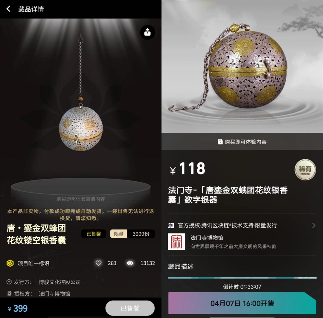 早在2022年年初,「幻核」与「Hi元宇宙」同步发行法门寺博物馆的「唐·鎏金双蜂团花纹镂空银香囊」这一事件,便引发了广泛热议。