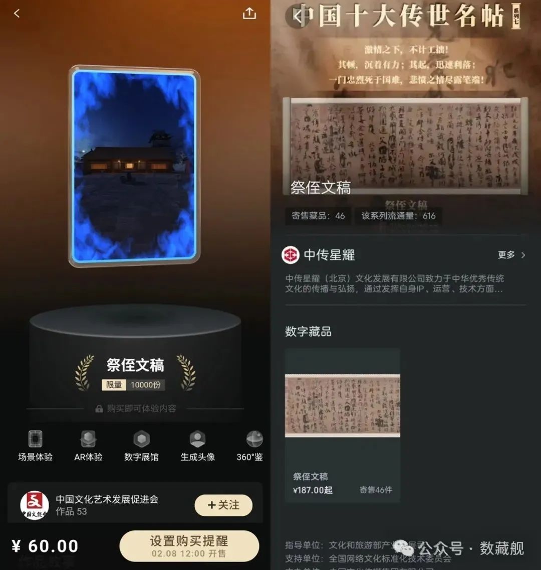 除了「中传新文创」和「鲸探」,还有「凤凰艺品」、「秦宇宙」、「灵境·人民艺术馆」、「文博元宇宙」、「ARTVERSE」、「博藏未来」、「长安锦绣」、「甲骨文元宇宙」、「大唐灵境」等十多家数藏平台也曾发行过相应的藏品。