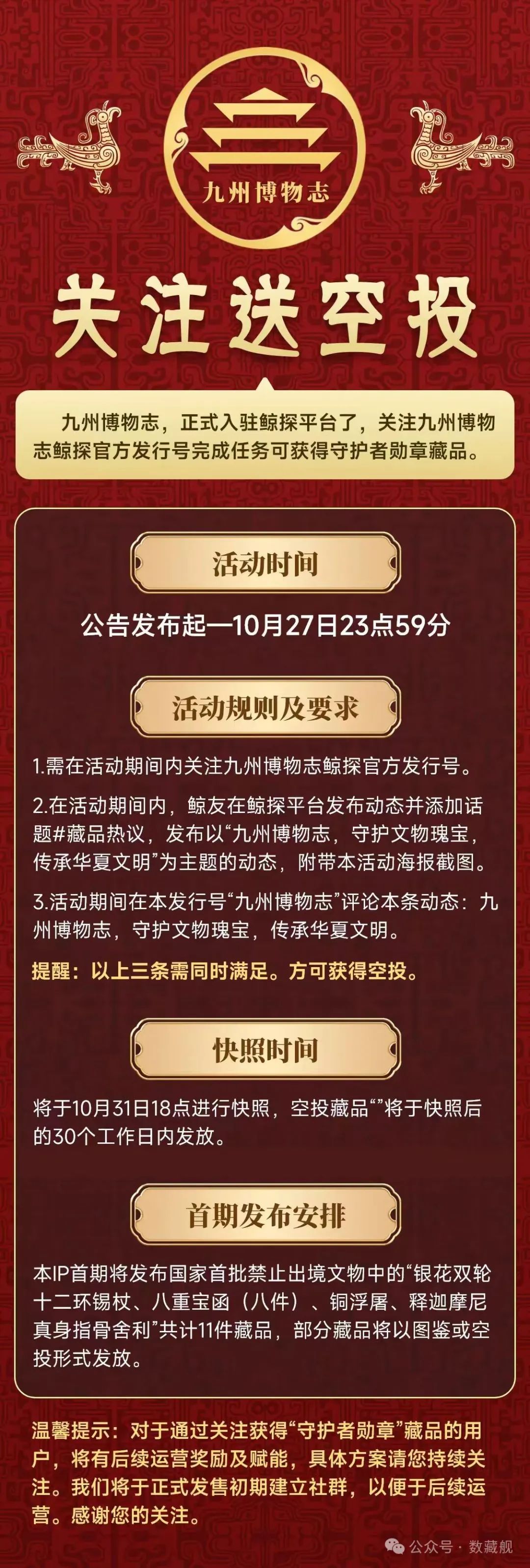 据发行方页面介绍,「九州博物志」是一个集历史、文化、艺术于一体的综合性IP,其首期发行计划涵盖了国家首批禁止出境文物中的银花双轮十二环锡杖、八重宝函(八件)、铜浮屠、释迦摩尼真身指骨舍利共计11件藏品。同时「九州博物志」还提到,其旗下主要IP还有后母戊鼎、虢季子白盘、淳化大鼎、何尊、铜浮屠、释迦摩尼真身指骨舍利等各地馆藏文物。