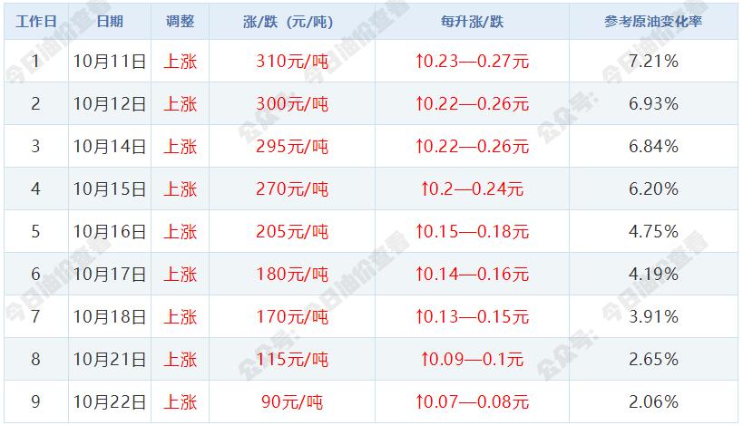 预计油价上涨均价为:92号汽油平均上涨0.07元/升;95号汽油平均上涨0.08元/升;0号柴油平均上涨0.07元/升。
