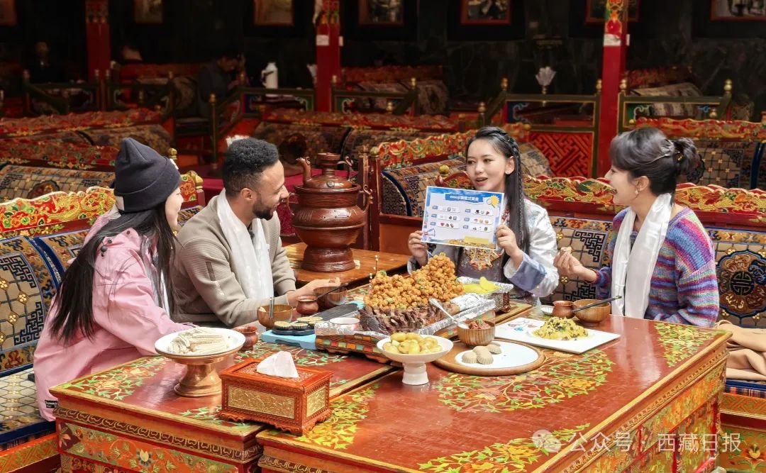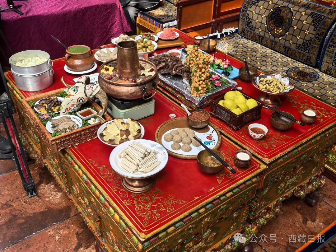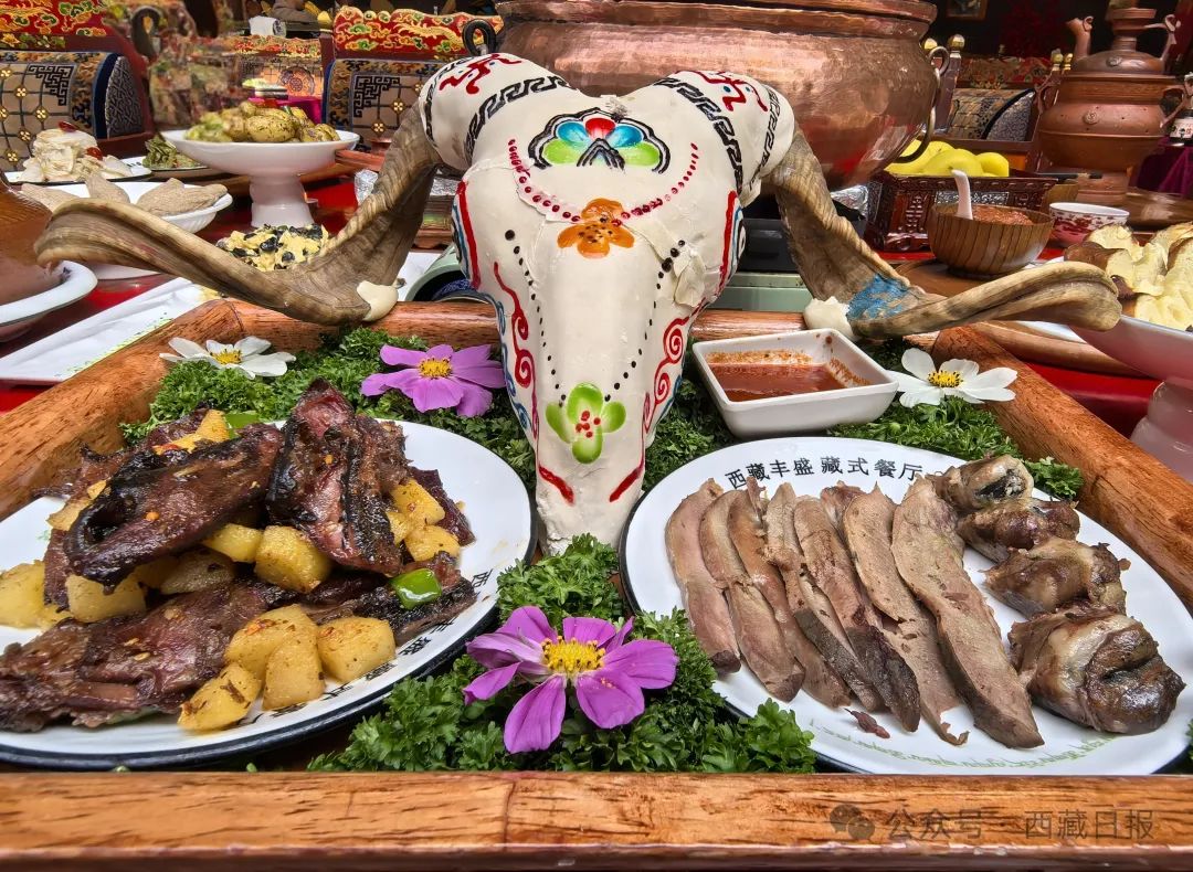 该菜品是将羊头肉取下后烹饪成孜然味,配以糌粑。将羊头骨作为装饰摆盘,整体菜品寓意吉祥)、烤岗巴羊腿(岗巴羊肉质细嫩、味道鲜美、无膻味。此菜品将岗巴羊整腿浇藏式辣椒、孜然粉等腌制后,烤制7分熟,外焦里嫩,口感十足。)