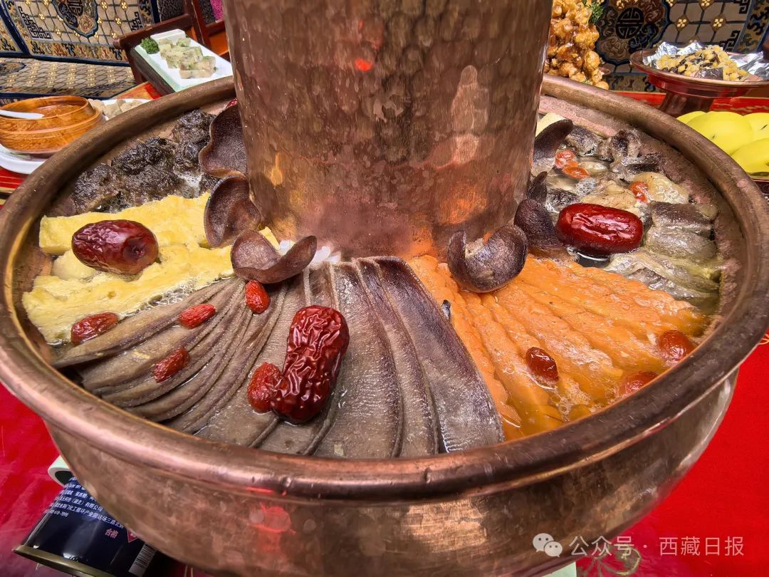 “一锅煮尽千百味”藏式火锅以本地牦牛骨汤熬制底味,以本地牦牛肉片、牦牛肉丸、本地土豆、新鲜蔬菜、日喀则藏豌豆粉条等组成。以食材本身的味道为主,锅底以清汤为主,味道鲜美可口,老少皆宜。最传统的藏式火锅一开始用的是陶制容器,后来引入涮羊肉用的大铜锅。与其他火锅明显不同的是,藏式火锅是把各种荤菜、素菜提前煮熟然后整齐摆放在锅中的。