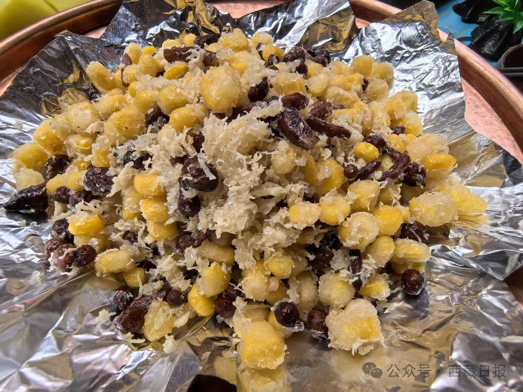 该菜品译为“吉祥如意”,是藏族习俗中婚宴等喜事中常点菜品之一。将人生果和玉米煮熟后加入白糖调味,将酥油融化之后搅拌后撒入奶渣粉,味道以酸甜相间。