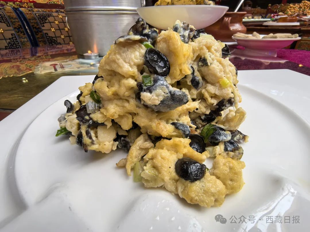 日喀则亚东县的黑木耳是国家地理标志产品,具有个小饱满和鲜嫩可口等特点,具有丰富的营养。该菜品将亚东木耳和藏鸡蛋有机结合,炒制后具有独特的鲜香味。