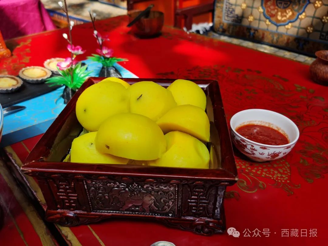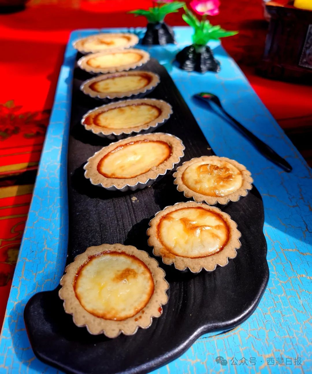日喀则享有世界青稞之乡的美誉,孕育出众多青稞系列美食。青稞蛋挞是青稞创新菜品之一,将糌粑捏团至蛋挞形状后灌注藏鸡蛋和牦牛奶,通过高温烤制,将日喀则青稞摇身变成了现代食品蛋挞。