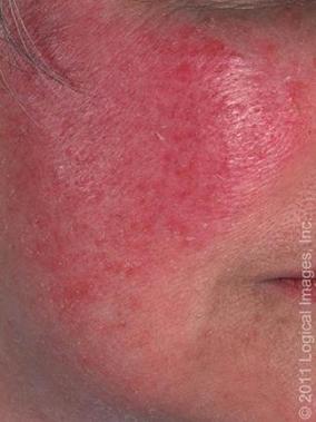 面中部红斑和毛细血管扩张是玫瑰痤疮的常见特征,皮肤潮红是最早出现的症状之一,可能受情绪、热或冷、运动、辛辣或热食及酒精刺激而出现。