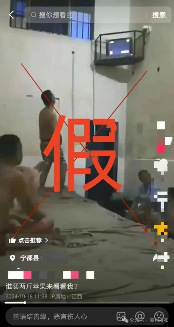 近日,宁都县公安局竹笮派出所民辅警在日常工作中发现,网民赖某在短视频平台发布其“关押”在宁都县看守所内的视频,该视频标记定位为“宁都县XXX”,配文“谁买两斤苹果来看看我”,引发关注,造成不良社会影响。