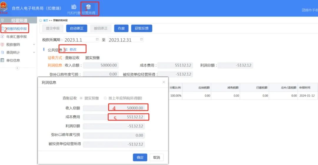 点击【经营所得】-【预缴纳税申报】,点击公共消息右侧【修改】,录入“收入总额”“成本费用”,点击【确定】。