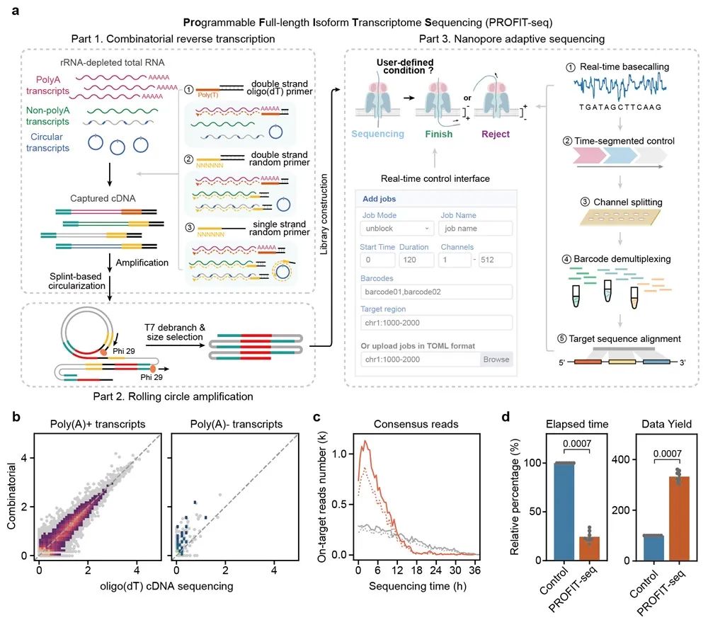 PROFIT-seq通过创新的复合逆转录策略和滚环扩增技术,不仅能够捕获多种类型的转录本(包括多聚腺苷酸化、非多聚腺苷酸化和环状RNA等),还可以在测序过程中实时控制,根据需要选择性地富集目标转录本。此外,该团队设计了基于最大期望算法的全转录组智能定量模型,结合目标转录本的全长序列和其他非目标分子的短时测序标签,实现了精准的全转录组定量分析。与传统方法相比,PROFIT-seq大幅提高了样本中目标转录本的检测效率和测序通量。
