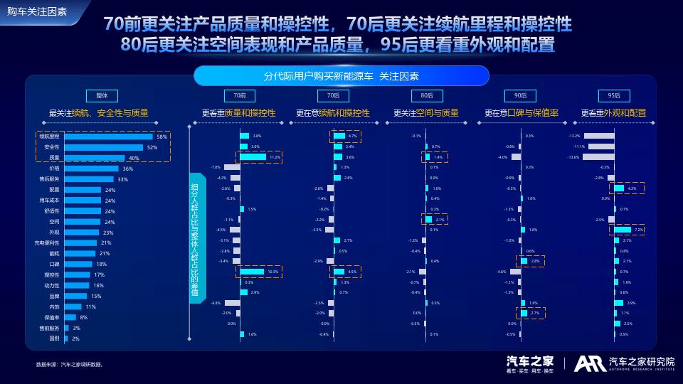 在《2024新能源车用户需求与产品洞察》报告中数据提示出了大众需求的边界,70前更关注产品质量和操控性,70后更关注续航里程和操控性80后更关注空间表现和产品质量,95后更看重外观和配置。而在焦虑的问题中,70前更焦虑安全性问题,80后更担心二手车保值率,90后更焦虑新车快速降价及老平台车型无法升级,95后更担忧付费订阅模式。