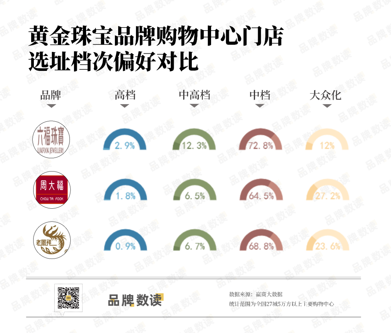 六福珠宝在高档、中高档、中档购物中心门店的占比均高于周大福和老凤祥,仅有12%的门店位于大众化购物中心。