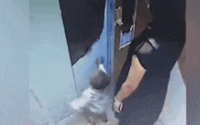 家长带着孩子乘坐电梯,孩子的手放在电梯门上,随着电梯门打开,孩子的手跟着被拉到了电梯和门柱的夹缝中。