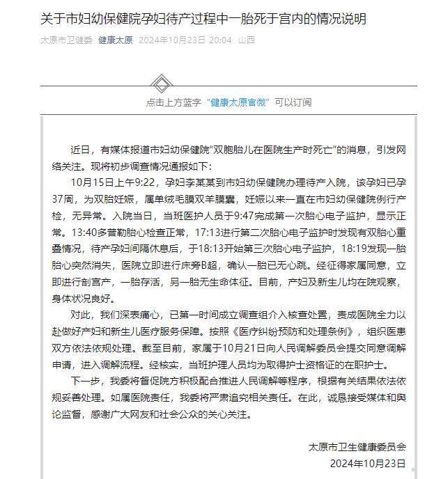10月23日,山西太原市卫生健康委员会通报:近日,有媒体报道市妇幼保健院“双胞胎儿在医院生产时死亡”的消息,引发网络关注。现将初步调查情况通报如下: