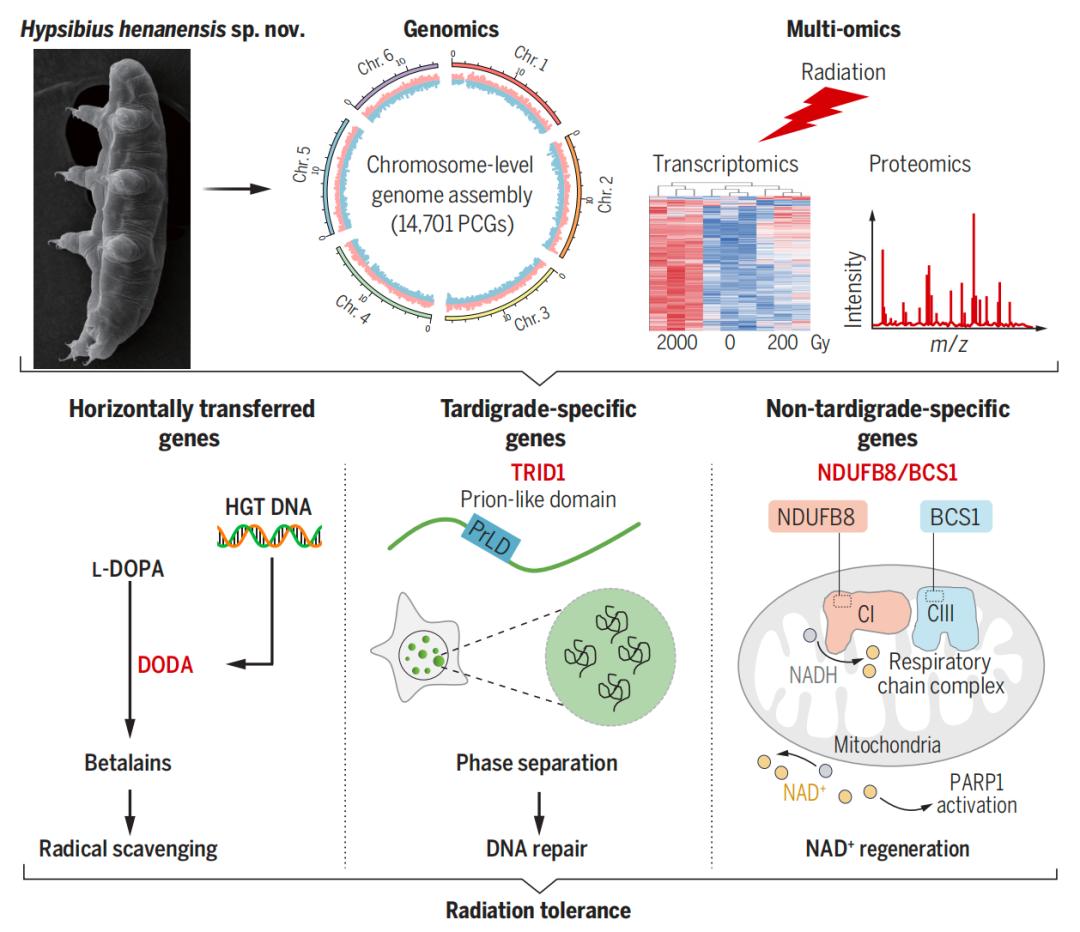该研究报道了一种在河南新发现的水熊虫——河南高生熊虫(Hypsibius henanensis),并建立了其实验室培养体系,绘制了高质量基因组图谱,在国际上首次整合转录组、蛋白质组响应超强辐射的动态变化及分子进化和功能特征分析,进而揭示了河南高生熊虫耐受超强辐射的三类机制,并分别对代表性关键分子进行了深入的功能和机制研究。