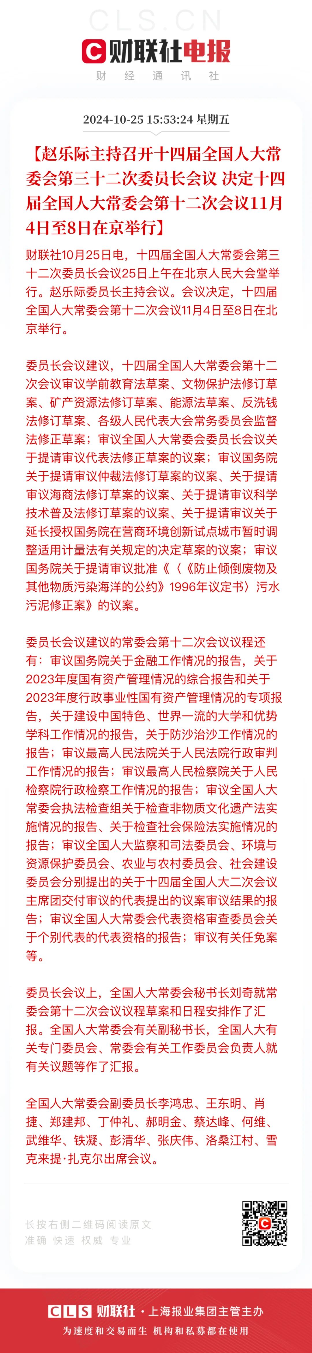 财联社向上滑动看下一个原标题:《十四届全国人大常委会第十二次会议将于11月4日至8日在京举行》