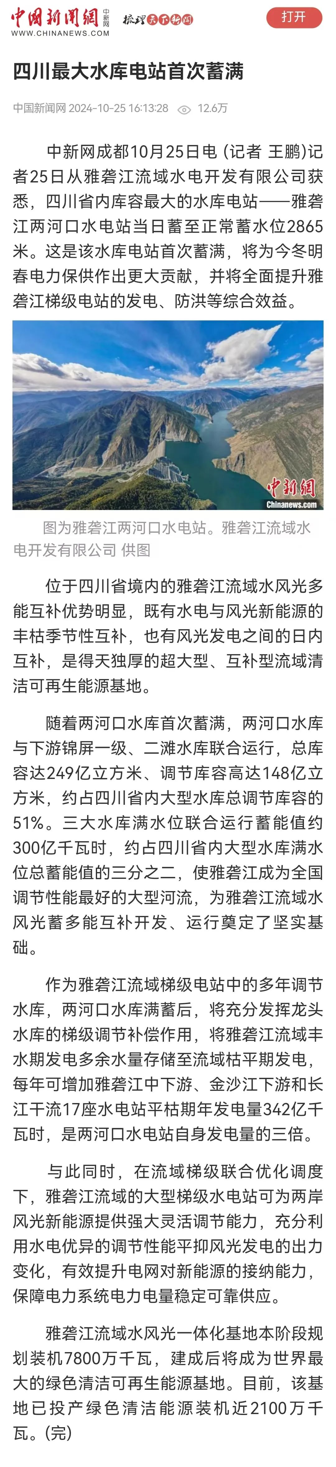 雅砻江两河口水电站上游目前,雅砻江流域水风光一体化基地已投产绿色清洁能源装机近2100万千瓦,生产的每一度电都为零碳绿电。基地已投产装机约占四川全省清洁能源装机五分之一,拥有四川省最大的三座水库电站,对优化电源结构、保障电力供应具有重要作用。作为我国第三大水电基地唯一开发主体,由国家开发投资集团有限公司和四川省投资集团有限责任公司共同出资,国投雅砻江公司充分发挥“一个主体开发一条江”的独特优势,深挖雅砻江梯级电站联合优化运行潜力,大力发挥大水电顶峰保供主力军作用,积极探索水风光协同运行机制,有力应对极端异常气候、流域极端特枯来水等诸多不利因素和风险挑战,坚决扛起电力保供和防洪抗旱责任,为川渝、华东、华中地区经济社会发展发挥重要作用,为中国式现代化建设贡献清洁动能。