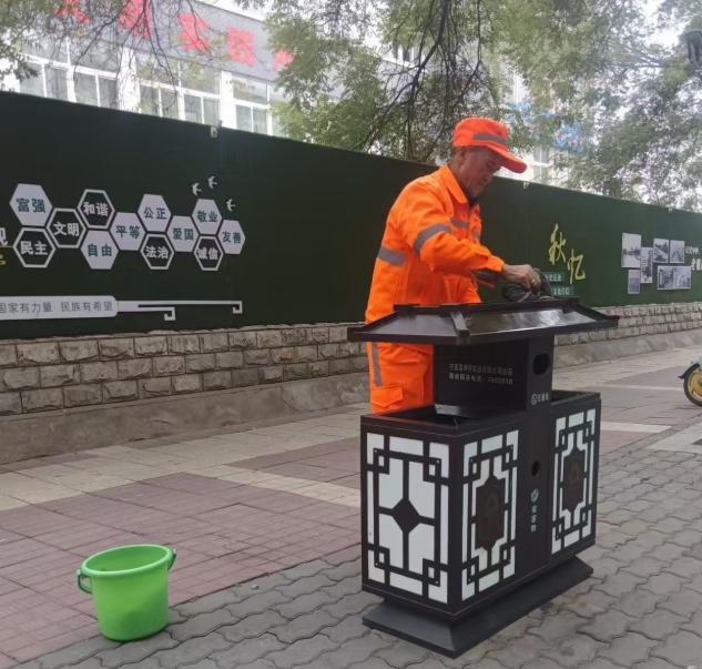 张晓林说,从老家来到银川十几年了,摆过地摊、干过餐饮,都不太顺利,最后选择了环卫工人的工作。最初,总觉得有点抬不起头来,后来,慢慢地发现大家其实对环卫工人还是挺尊重的,渴了可以在临近店铺接热水喝,商家总是笑脸相迎,夏天,还有商铺为环卫工人准备防暑饮料,感觉就像是对待家里人,别提有多暖心了。工作中,张晓林注意到银河巷垃圾桶内胆频繁损坏,为了节省资源和降低成本,他想出了一个巧妙的办法——利用日常收集的废旧塑料袋对果皮箱内胆进行包裹。这个小小的举动,不仅延长了垃圾桶的使用寿命,还为环保事业贡献了一份力量。