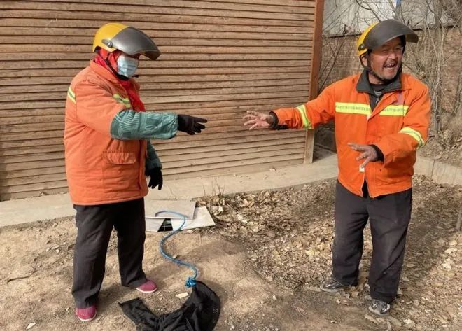 由于惊吓和体力不支,男孩被救上来后就瘫倒在地,岑玉梅和周希福为孩子披上棉衣,盖上环卫车上放着的小毯子,随后打了110报警。