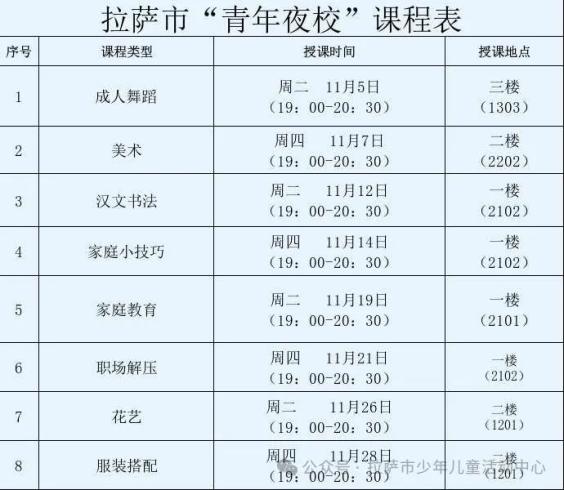 为深入贯彻落实习近平总书记关于青年工作的重要论述,落实市委、市政府《拉萨市青年发展型城市建设试点实施方案》和《拉萨市建设青年发展型城市13条惠青举措》青年政策,更好推进青年发展型城市建设,进一步满足广大拉萨青年的发展需求,拉萨市团委立足青年精神文化需求,依托拉萨市少年活动中心阵地,打造拉萨团属青年夜校,为青年打造交流新平台、为青年开辟动力新天地,让“白天上班,晚上学艺”成为拉萨青年新式夜生活的风向标,现免费开设书法、美术、舞蹈、家庭教育、家庭小技巧、职场解压、花艺、服装搭配等8门课程。