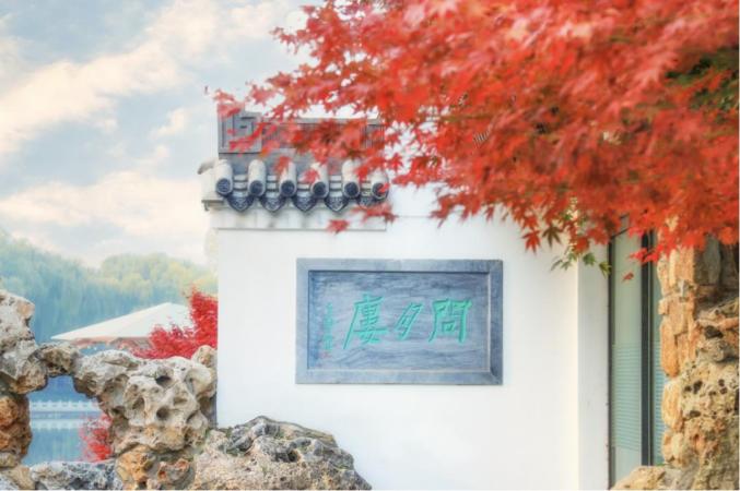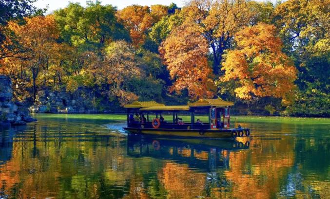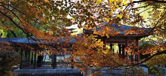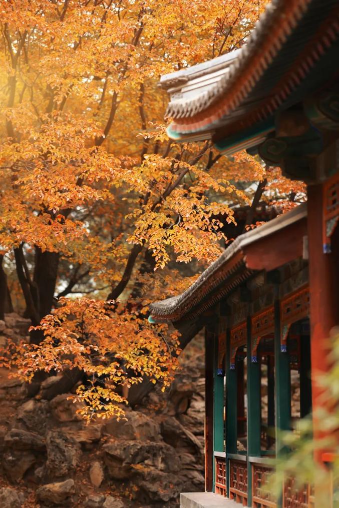 谐趣园涵远堂东侧、西侧土石结合的假山上自然生长着数十株北京乡土树种大果榆,秋色叶由橙色——红色——棕色逐渐变化,与古建搭配,拍摄效果极佳。