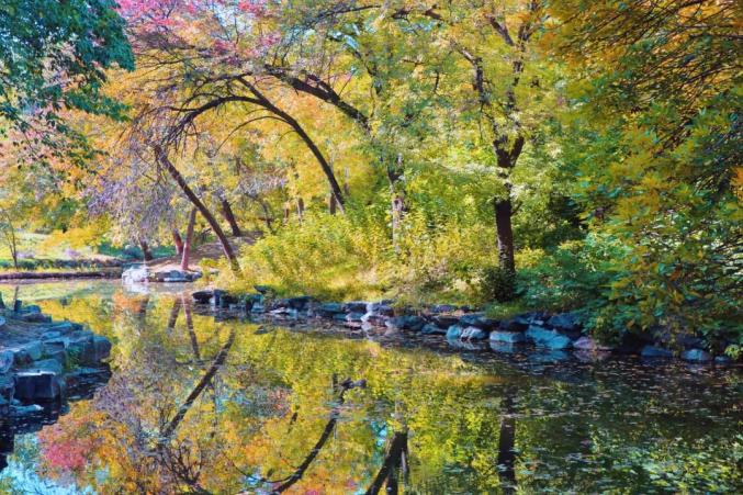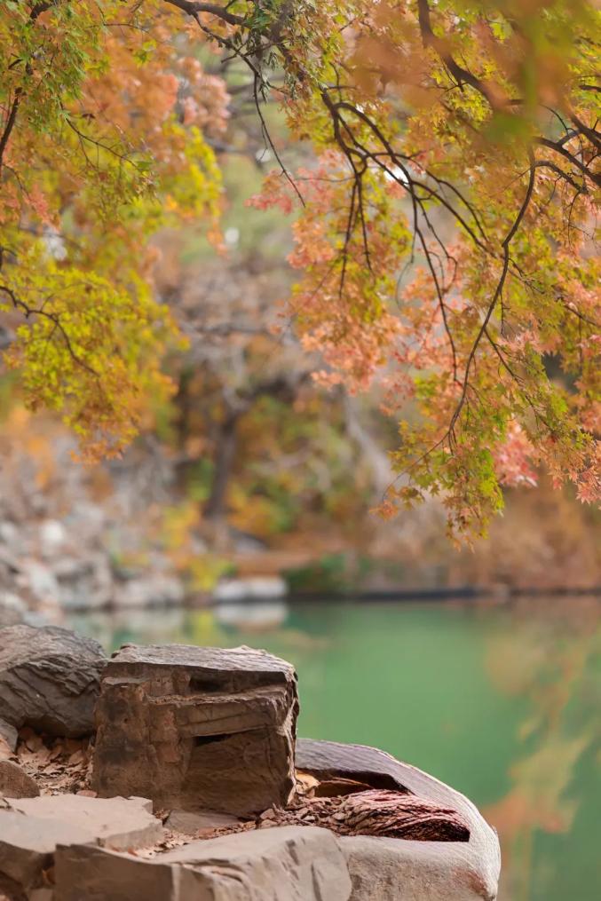 最佳拍摄时间是9点至10点,柔和的阳光洒在树叶和河面上,仿佛一幅绚丽的油画。