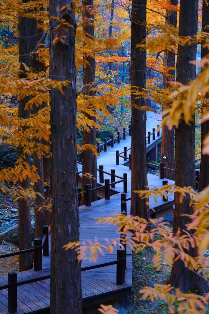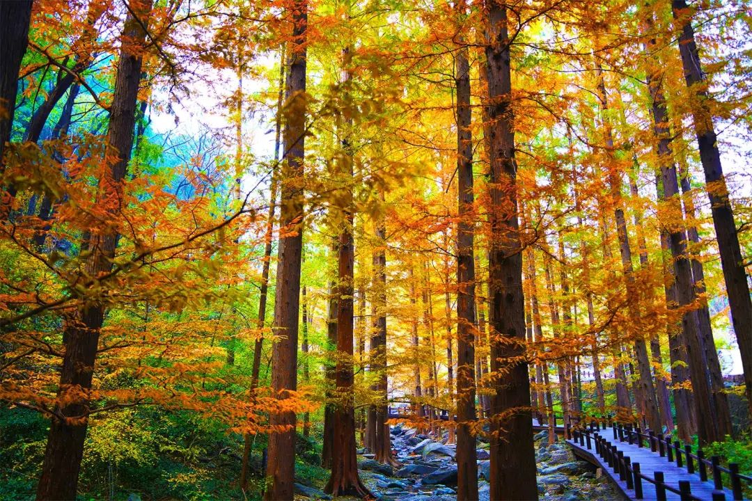 深秋之际,位于樱桃沟的水杉林换上秋装,尽显古朴肃穆。漫步于木质栈道上,高大秀丽的树体蔽日遮天,仿佛将时光的流转娓娓道来,透露着历经世事的坚毅沧桑。
