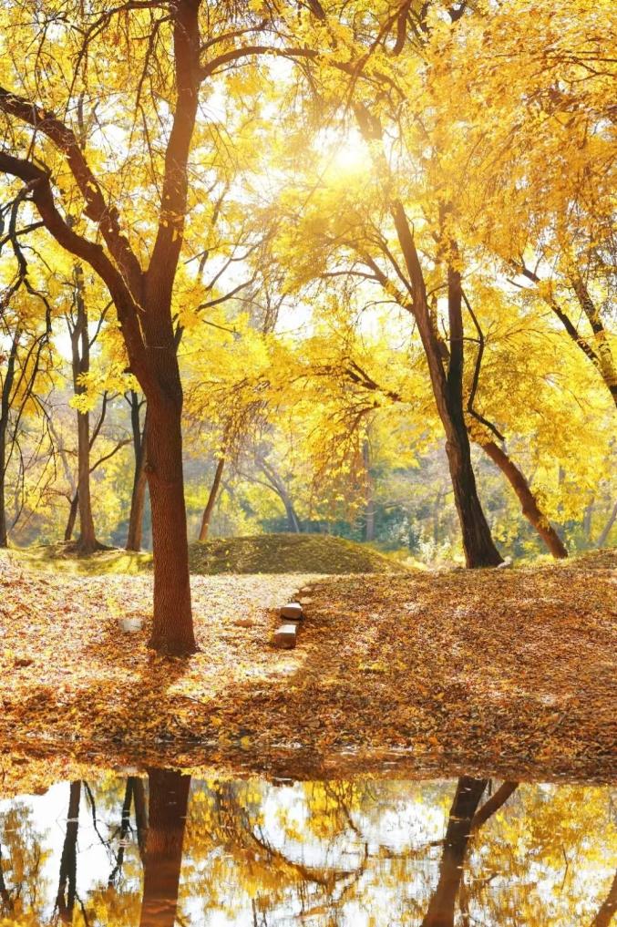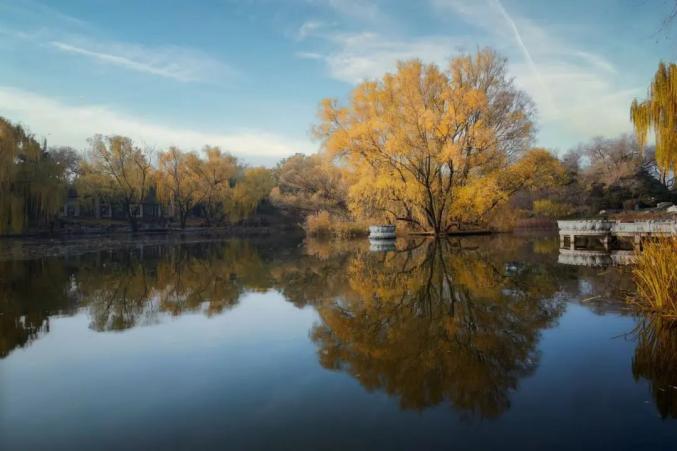 萍香榭是北京较早的黄叶区,也是很多汉服爱好者秋拍的第一站。这里的几棵白蜡树冠茂密,阳光下的叶子金灿灿地发着光,最绝的就是大块的水面,在晴空下展示了完整的树影,黄叶、湖面、倒影,像是打翻的调色盘。只是这里的叶子黄得快,落得也快,拍照要趁早。