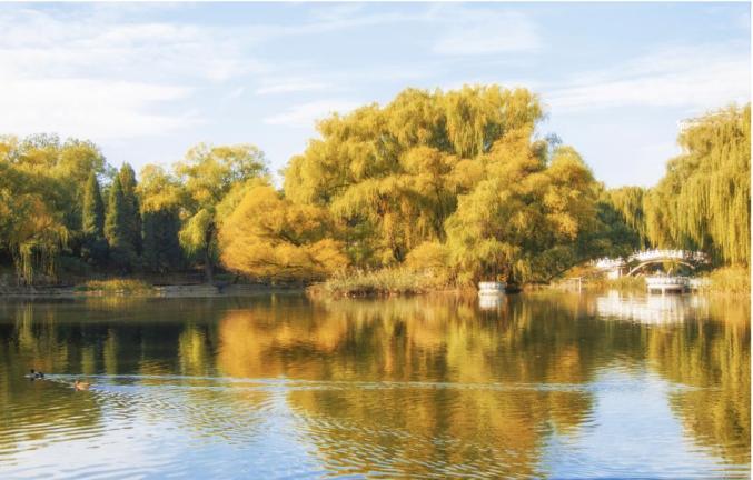 公园南小湖有一棵生长茂密、树形优美的旱柳,树冠有十几米高,可谓独木成林。深秋时节它与周围的残荷形成了一幅金色的天然画卷。
