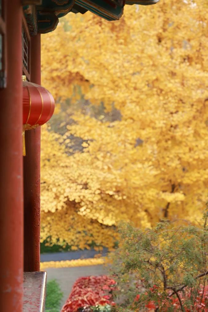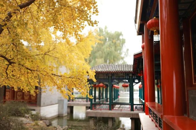 紫菱洲的银杏搭配着水中的长廊和后面的建筑,古韵十足。