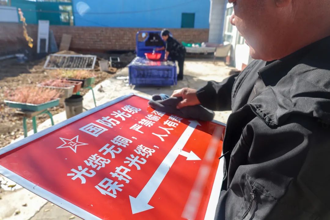 只见他拿着红色的国防光缆警示牌站在路旁