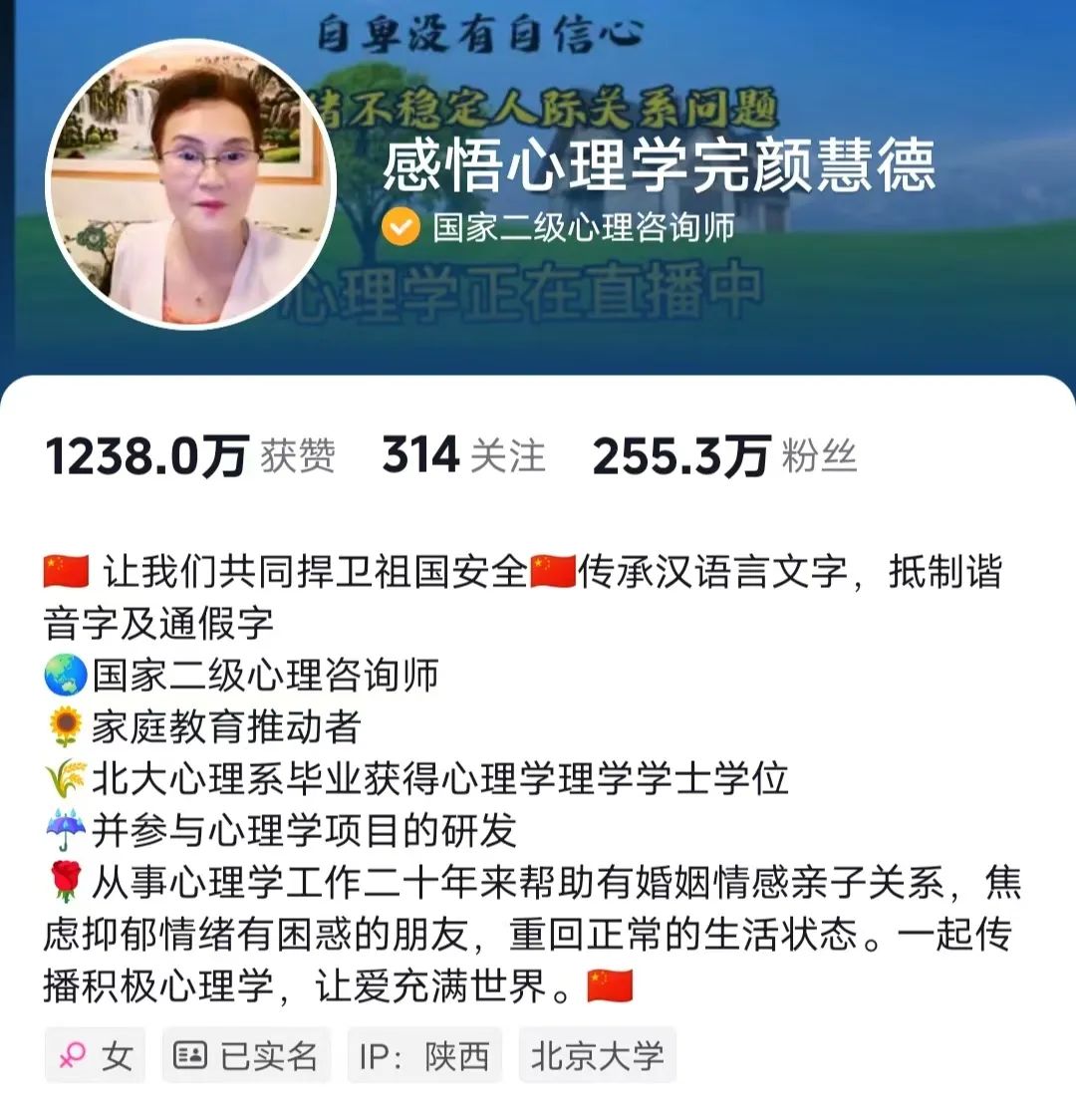 她是一位来自陕西的“黄V知识区博主”,全名“感悟心理学完颜慧德”,自称从事心理学工作二十年,在抖音平台直播,解答网友的心理咨询问题,因自身口音创造出的谐音热梗而走红网络。截至发稿,抖音平台的“完颜慧德”话题有超50亿次播放,其本人粉丝量也已超过255万。