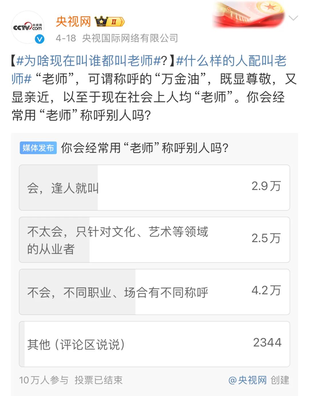 但也有2.9万人表示逢人就叫“老师”