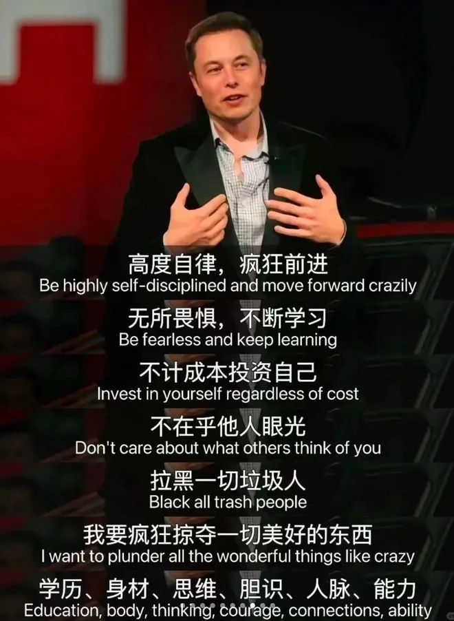 有近距离接触过马斯克的人感叹道:“马斯克把人看作是电脑,他把他的大脑软件看作是他拥有的最重要的产品。因为没有设计大脑软件的公司,所以他设计了自己的大脑软件,每天都对其进行测试,并不断进行更新迭代。”从不陷入无意义的内耗,保持内心丰盈,也让马斯克更加勇往直前,做想做的事,不留遗憾。