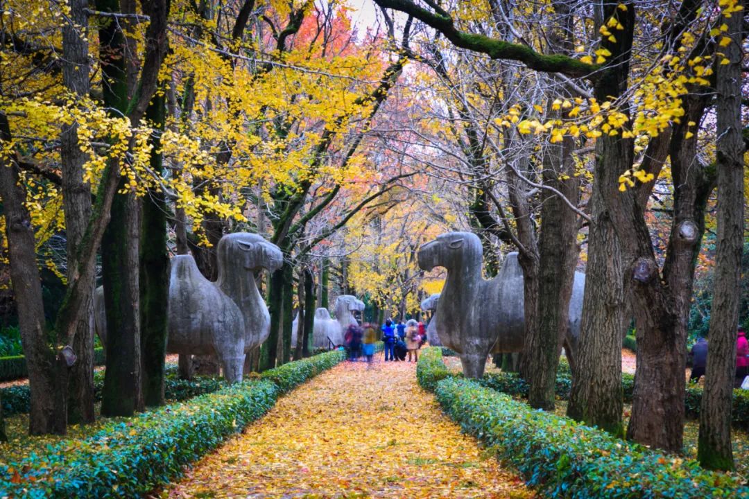 明孝陵明孝陵,为明清皇家第一陵,也是南京赏秋绝佳地,浓缩了整座金陵城的绝美秋色。一到秋天,明孝陵就像是上帝打翻的调色盘,秋天的银杏、梧桐、枫叶,或金黄或火红,五彩斑斓,色彩浓郁。