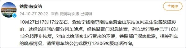 @铁路南京站 10月27日发布通报称,10月27日17时17分左右,受仙宁线南京南站至紫金山东站区间发生设备故障影响,途经该区间的部分列车晚点。经铁路部门紧急处置,列车运行秩序已于18时13分起逐步恢复。对由此给旅客出行带来的不便,铁路部门深表歉意。相关列车的晚点情况,请留意车站公告或拨打12306客服电话咨询。