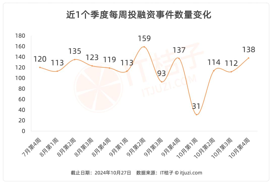 近一季度,新经济私募股权投资交易数量在周期性振幅中整体呈现平稳趋势。其中国庆节期间交易量有所下降,节后已恢复往日投资节奏,根据 IT 桔子统计,上周共发生 138 起投资并购交易。