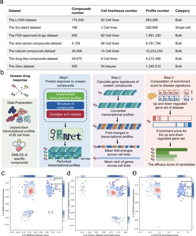 团队利用PRnet对各种化合物库进行计算机筛选,并生成了一个虚拟的大型扰动图谱集成图谱,涵盖88个细胞系和52个组织,以及包含935种FDA批准的药物、4,158种活性化合物、30,456种天然化合物和29,670种药物样的化合物库。PRnet还根据基因集的参考变化,为疾病提供了强大且可扩展的候选药物推荐工作流程。PRnet根据概况图谱成功推荐了577种候选药物清单,用于治疗233种不同的疾病。在3种代谢紊乱病例中,包括非酒精性脂肪性肝炎(NASH)、多囊卵巢综合征(PCOS)患者和炎症性肠病(IBD),PRnet推荐的药物得到了先前人类或动物研究文献的支持。