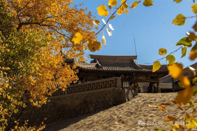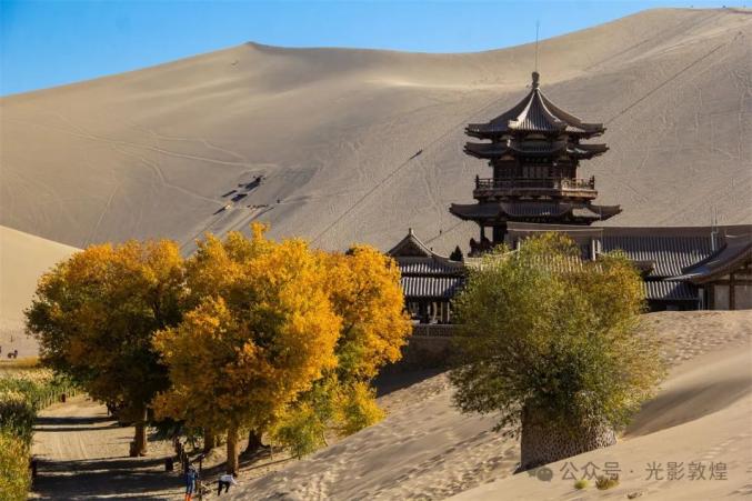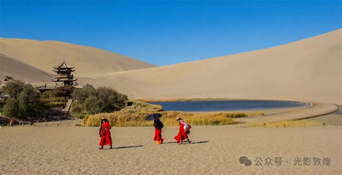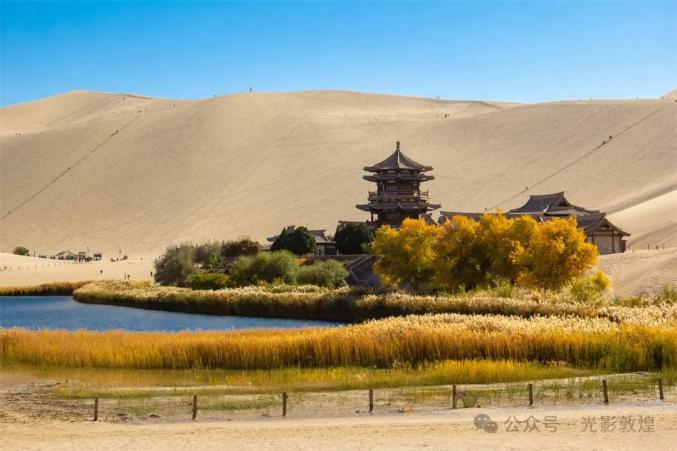月牙泉犹如一颗璀璨的绿宝石镶嵌在鸣沙山的怀抱中。秋季的泉水更加清澈,碧绿的泉水与周围的金黄形成鲜明的对比。泉边的芦苇也渐渐变黄,在微风中轻轻摇曳,为月牙泉增添了一份别样的景致。在这宁静的氛围中,人们可以更好地欣赏大自然的美景,感受沙漠的广袤和泉水的静谧。远处的蓝天、白云与近处的沙漠、泉水相互呼应,构成景区内的古建筑和文化遗迹,在秋季的氛围中更显古朴和庄重。
