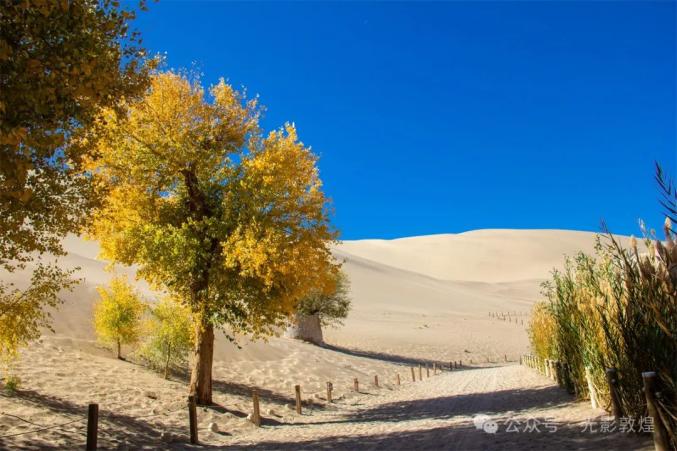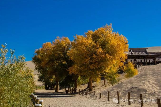 秋天的鸣沙山,在阳光的照耀下,沙子呈现出更加耀眼的金黄色。鸣沙山月牙泉景区内不少百年胡杨,到了秋季,树叶逐渐变色,呈现出红、黄、橙等斑斓的色彩,与金黄的沙漠相互映衬,为单调的沙漠增添了一抹绚丽的色彩。