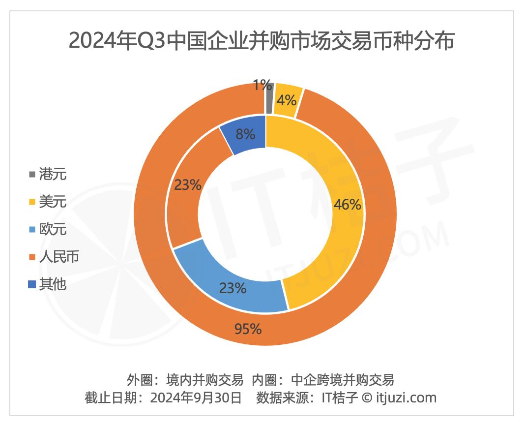 从币种分布来看,毫无疑问,在境内并购交易中,人民币是核心货币,2024Q3季度境内并购交易有95%是采用人民币交易,4%采用美元交易,1%采用港元交易。