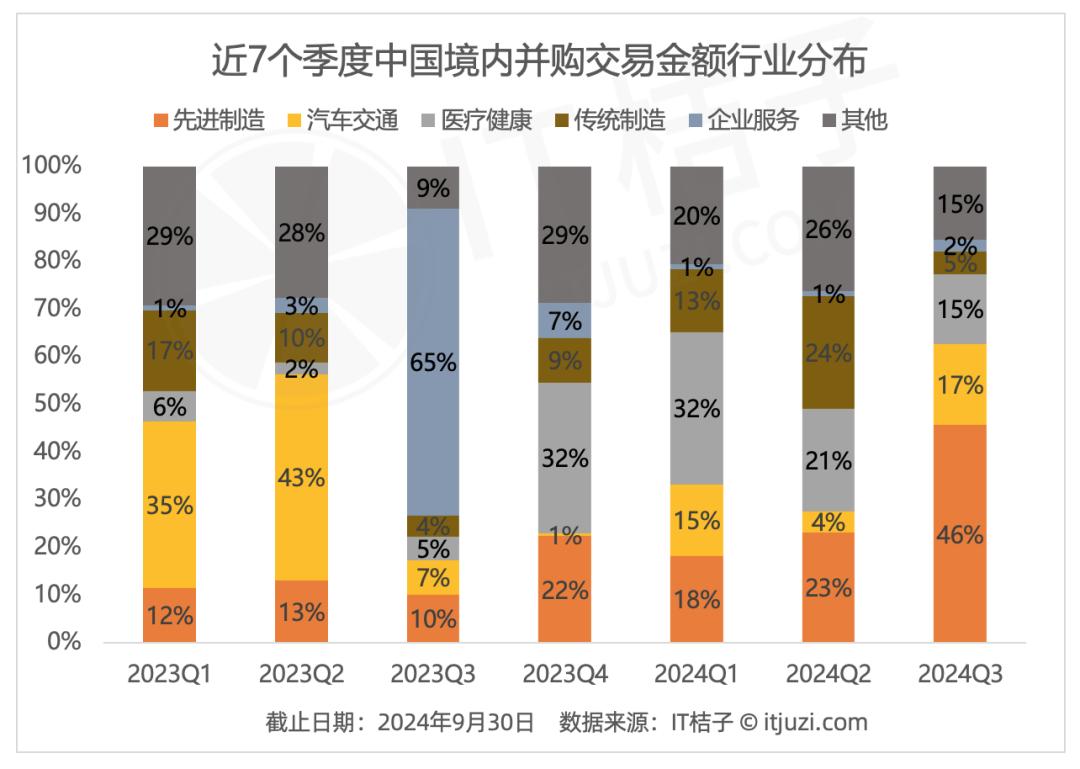 在2024年第三季度,先进制造行业共发生53起并购交易事件,涉及金额375.2亿元,占第三季度并购交易总金额的比重最大,为46%,成为国内并购资金体量最大的领域。其中,TCL集团通过控股子公司TCL华星光电技术有限公司收购乐金中国80%股权,交易价格达到108亿元人民币,是Q3季度国内并购金额最高的事件。