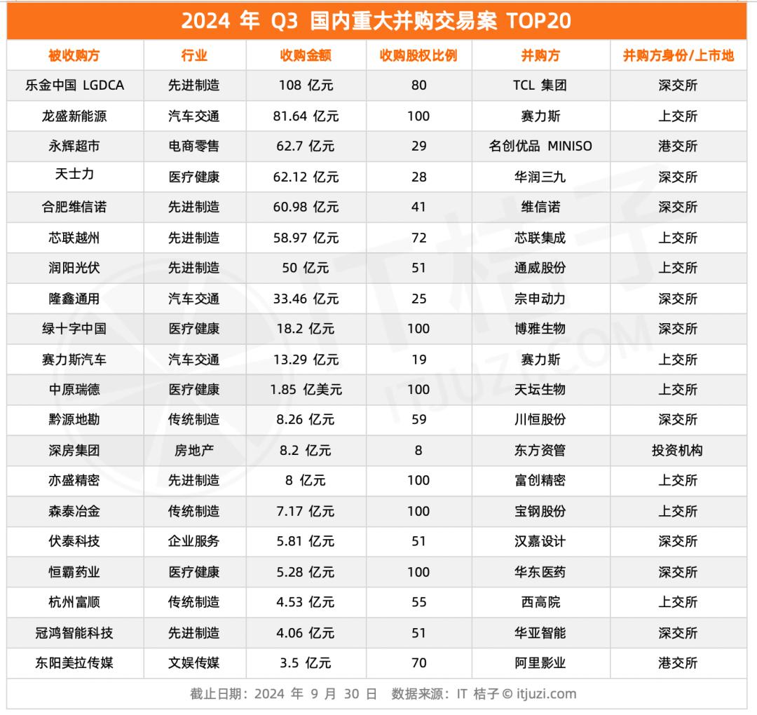 根据IT桔子整理,2024年Q3发生在国内最大单笔并购金额为108亿元,为A股上市公司TCL集团收购乐金中国;A股上市公司汽车整车及零部件制造商赛力斯81.64亿元全资收购龙盛新能源,是今年三季度第二大并购交易事件;名创优品收购永辉超市29.4%股份,成第一大股东,交易价格达62.7亿元,是2024年Q3第三大并购交易事件。