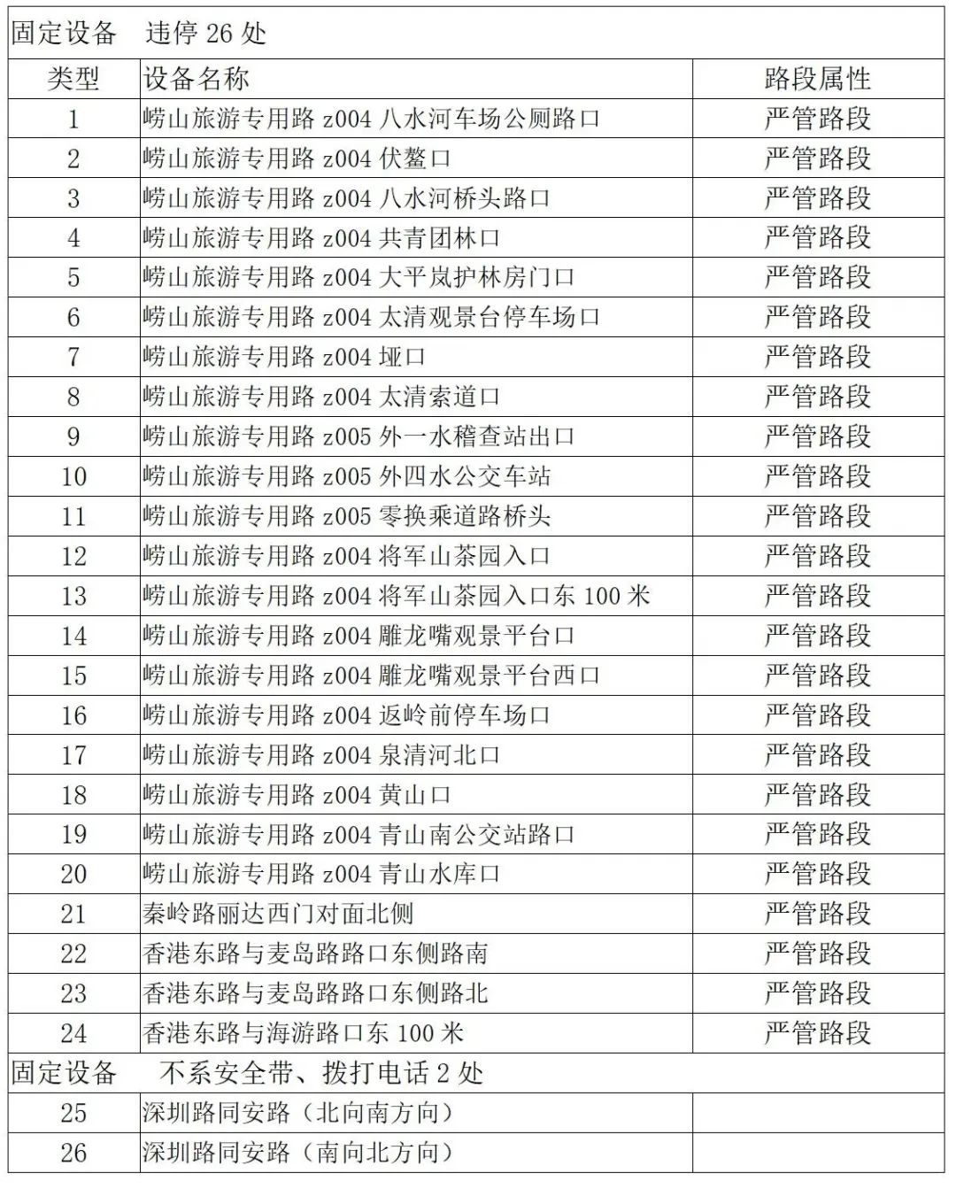 为进一步加强道路交通管理,规范驾驶行为,创造安全、畅通的道路交通环境,青岛崂山交警依据相关法律法规,结合群众诉求,新增26处交通违法抓拍设备,请各位驾驶员遵守交通法律法规。