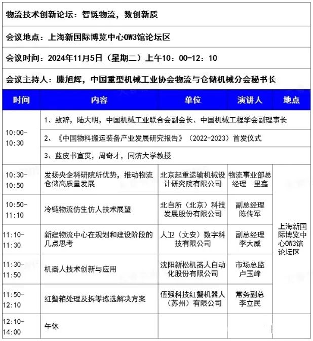 11月5日上午场,“智链物流,数创新质”物流技术创新论坛聚焦于物流技术的创新与应用,将探讨物流系统的智能化升级技术、供应链的协同与整合、以数据为驱动的高效管理模式、物流装备行业在数字化转型和创新驱动下的新趋势和新要求。