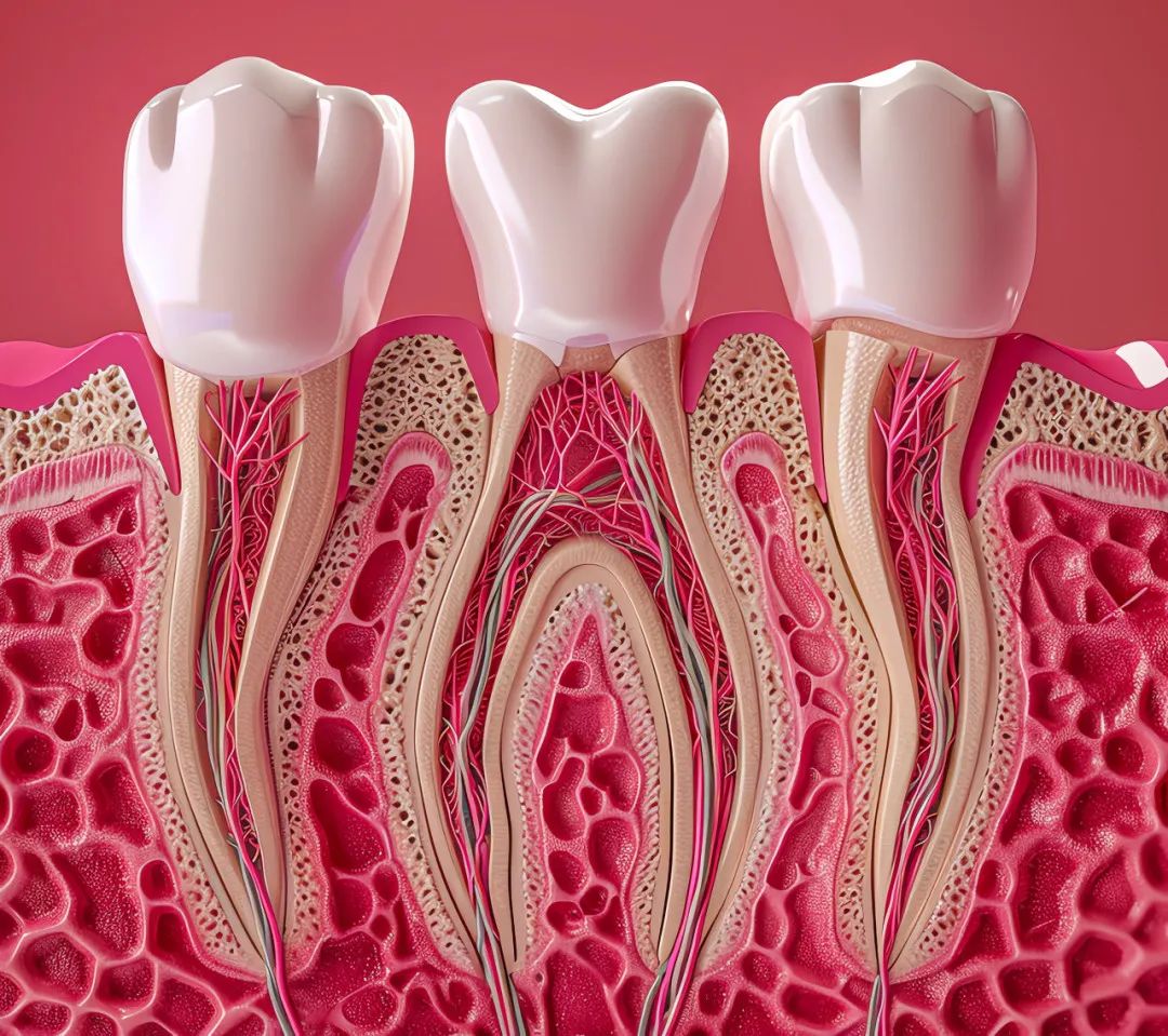 牙骨质 是覆盖于牙根表面,硬度与骨相似的一层“盔甲”。牙骨质是牙体组织的一部分,通过牙周膜参与牙齿的固定。牙周膜 也称牙周韧带,是数条不同方向走行围绕牙根并连接牙根和牙槽骨的致密结缔组织。我们可以把牙周膜想象成数条极细的“安全带”,一头固定在牙槽骨内壁上,另一头固定在牙骨质上,把牙齿牢牢地悬吊在牙槽窝内。我们在吃东西时,牙周膜可以起到支持和传导咀嚼力的作用,同时对疼痛、咀嚼时产生的压力和震动敏感,可防止过大的力量损坏牙齿和牙槽骨。此外,其还可以起到营养牙骨质和牙槽骨的作用。