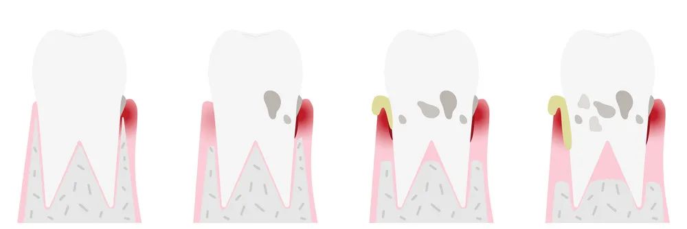 牙龈出血 即“沙发罩”破了,这可能是最早被发现的牙周炎症状,刷牙时出血,咬硬物时也出血,牙龈颜色变暗红,且由于水肿显得光亮。牙周袋形成 就是牙龈与牙齿之间因为各种情况不再贴合,形成了深度超过3毫米的、像“口袋”一样的结构。正常情况下,健康的牙龈与牙齿之间的深度应小于3毫米。牙周袋形成说明炎症已从表浅的牙龈发展到了深层的牙周组织,有时还会有脓液从牙周袋溢出。