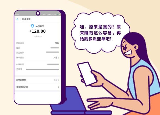 所有网络刷单的共同特征就是“做任务赚佣金”,“任务”大多为“点赞短视频”“关注公众号”“充值拿返利”“垫资刷销量”等。当有人让你做任务拿佣金时,千万不要相信。