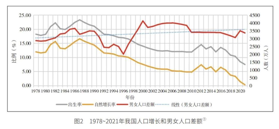 性别比例失衡、人口出生率下降等导致群体总量差额,决定了农村大龄未婚群体存在的长期性和客观性。在我国现行婚姻制度下,女性数量的绝对缺乏成为导致男性失婚的最根本原因。性别比例长期失衡叠加人口出生率持续下降,加重我国女性适婚人口总量稀缺,男性人口“过剩”长期存在且呈规模扩大态势,必然导致部分适婚男性尤其是农村大龄男性陷入失婚困境。
