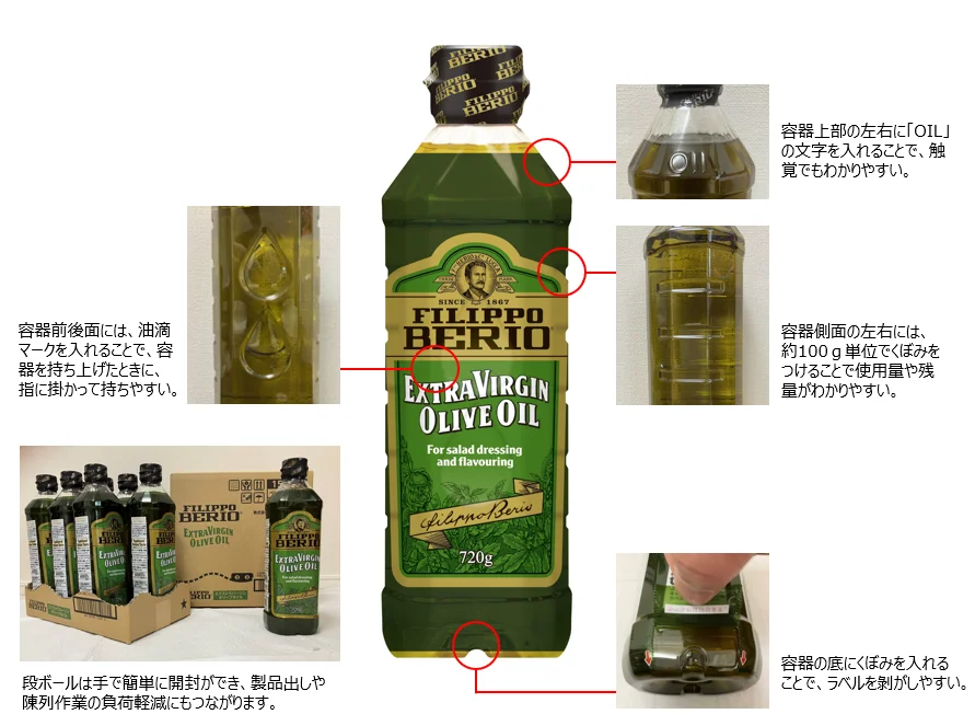 日本食用油脂生产商J-Oil Mills公司与东洋精工株式会社合作开发的“720g UD Eco-Pet”,在包装侧面设计了两个水滴形凹槽,方便在握持时放置手指。在包装的另一侧,他们用独特的凹陷设计为瓶子“划”了刻度,让消费者轻松确认剩余油量,避免浪费。